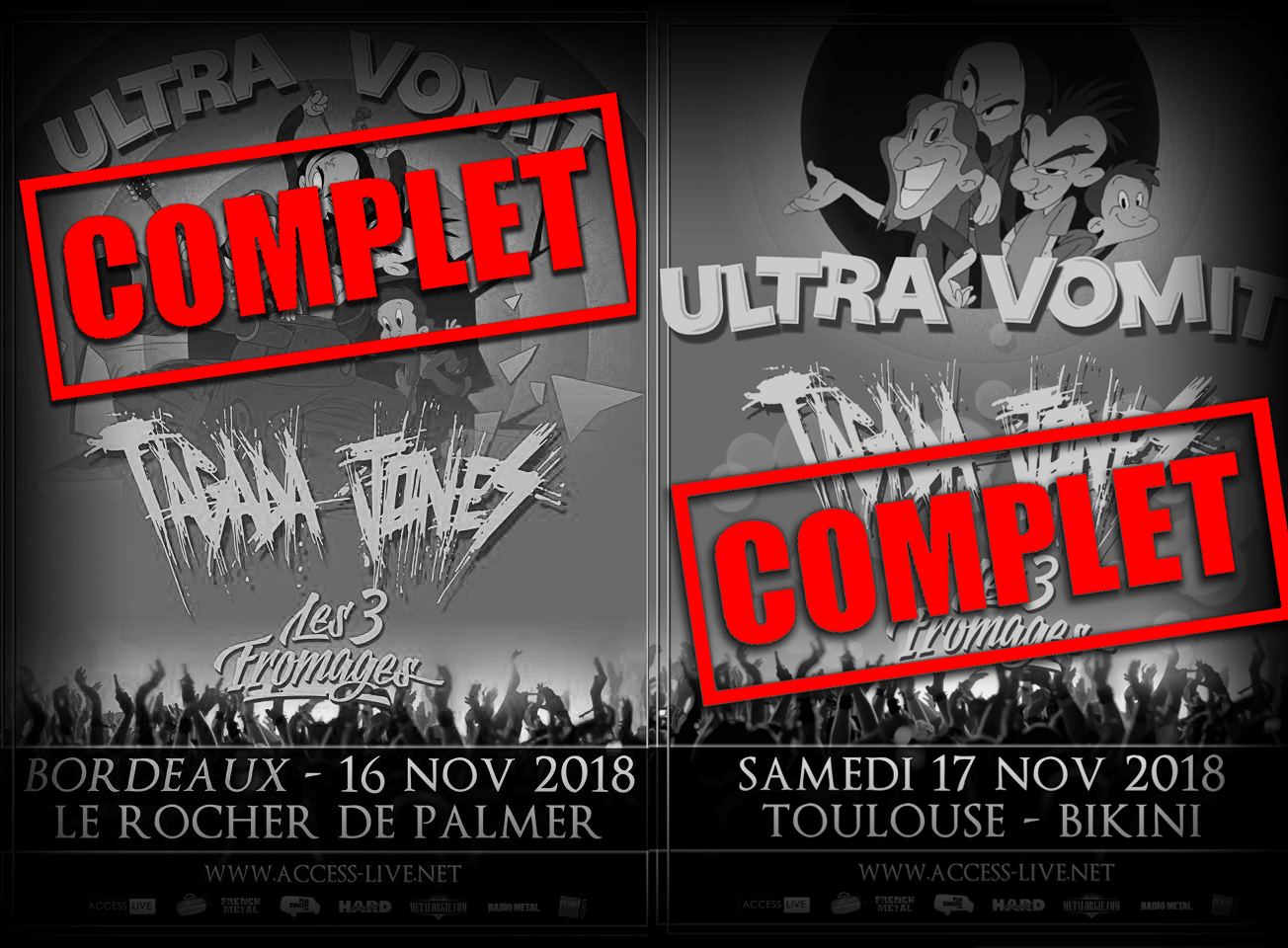 CENON et TOULOUSE SOLD OUTCe week-end nous jouerons avec nos amis d'Ultra Vomit et des 3 Fromages à Cenon (33) Rocher de Palmer et Toulouse (31) Le Bikini. Nous en profitons pour vous annoncer nos 54ème et 55ème concerts COMPLET de la tournée "La peste et le choléra" !!!!